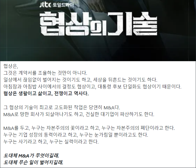 JTBC의 새 드라마 **'협상의 기술'**은 기업 인수합병을 둘러싼 치열한 협상과 심리전을 흥미롭게 그려낼 예정입니다.